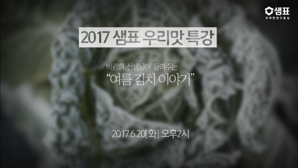 영상보기 강의 내용 여름 김치와 우리맛 강의 일자 2017년 6월 20일(화) 강의 장소 샘표 본사 10층 강사 박광희 발효 전문가 목록 댓글 댓글등록 / 500 이미지 첨부 이미지 삭제 등록 총 0건의 댓글이 있습니다. 등록된 댓글이 없습니다.