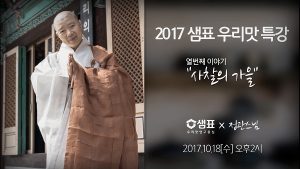 영상보기 강의 내용 사찰의 가을 강의 일자 2017년 10월 18일(수) 강의 장소 샘표 본사 10층 강사 정관 스님 목록 댓글 댓글등록 / 500 이미지 첨부 이미지 삭제 등록 총 0건의 댓글이 있습니다. 등록된 댓글이 없습니다.