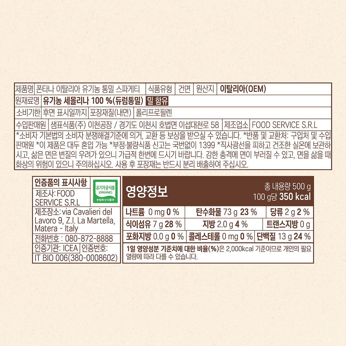 - 폰타나 이탈리아 유기농 통밀 스파게티 ( 500g )