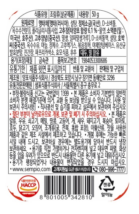 - 상품의 불량 또는 오배송 등의 샘표 책임사유의 교환인 경우는 배송료를 샘표에서 부담합니다. (단순 변심으로는 교환이 되지않습니다.)