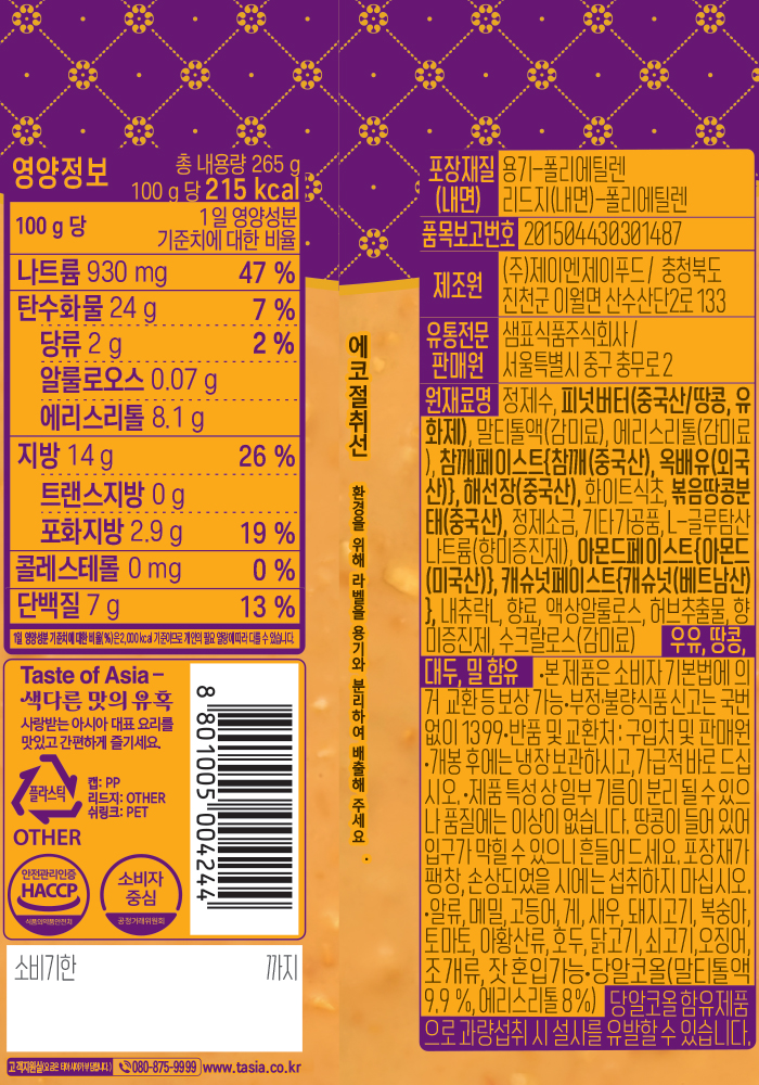 - 티아시아 저당 피넛 월남쌈 소스 ( 265g )