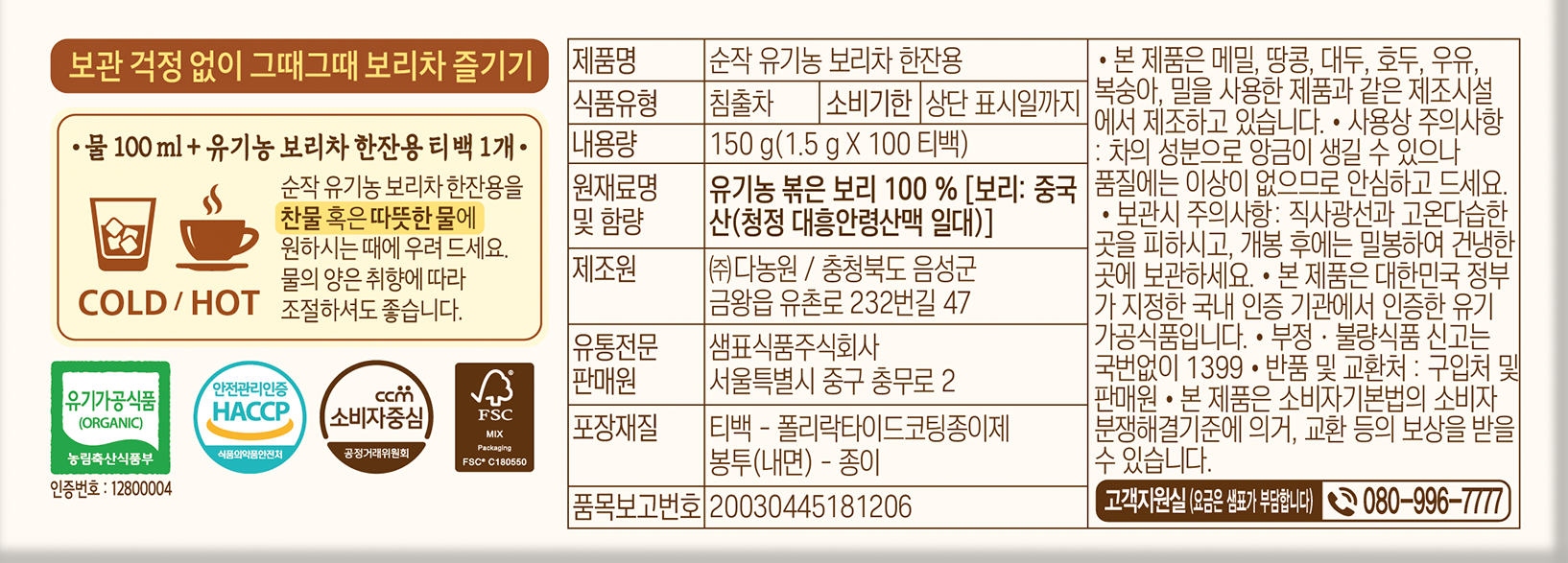 - 순작 유기농 한잔 보리차 티백 ( 150g )